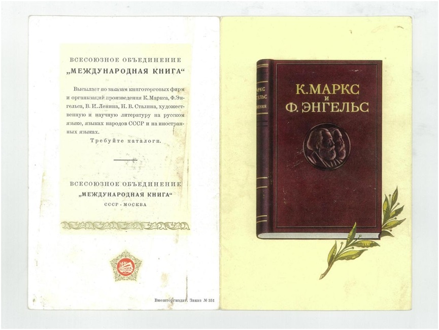 可根据图书销售公司和组织的订单,寄送用俄语、苏联各民族语言和各种外语写成的卡·马克思、弗·恩格斯、弗·伊·列宁、约·维·斯大林的著作,以及文学作品和科学文献。