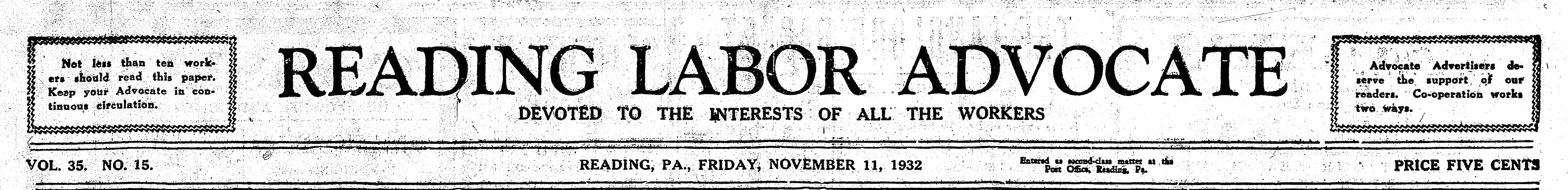 The Reading Labor Advocate was the official organ of the Socialist Party, USA of Berks County, Pennsylvania and of the Federated Trades Council of Reading. Here we present a run of the weekly paper from late 1932 to late 1934.
