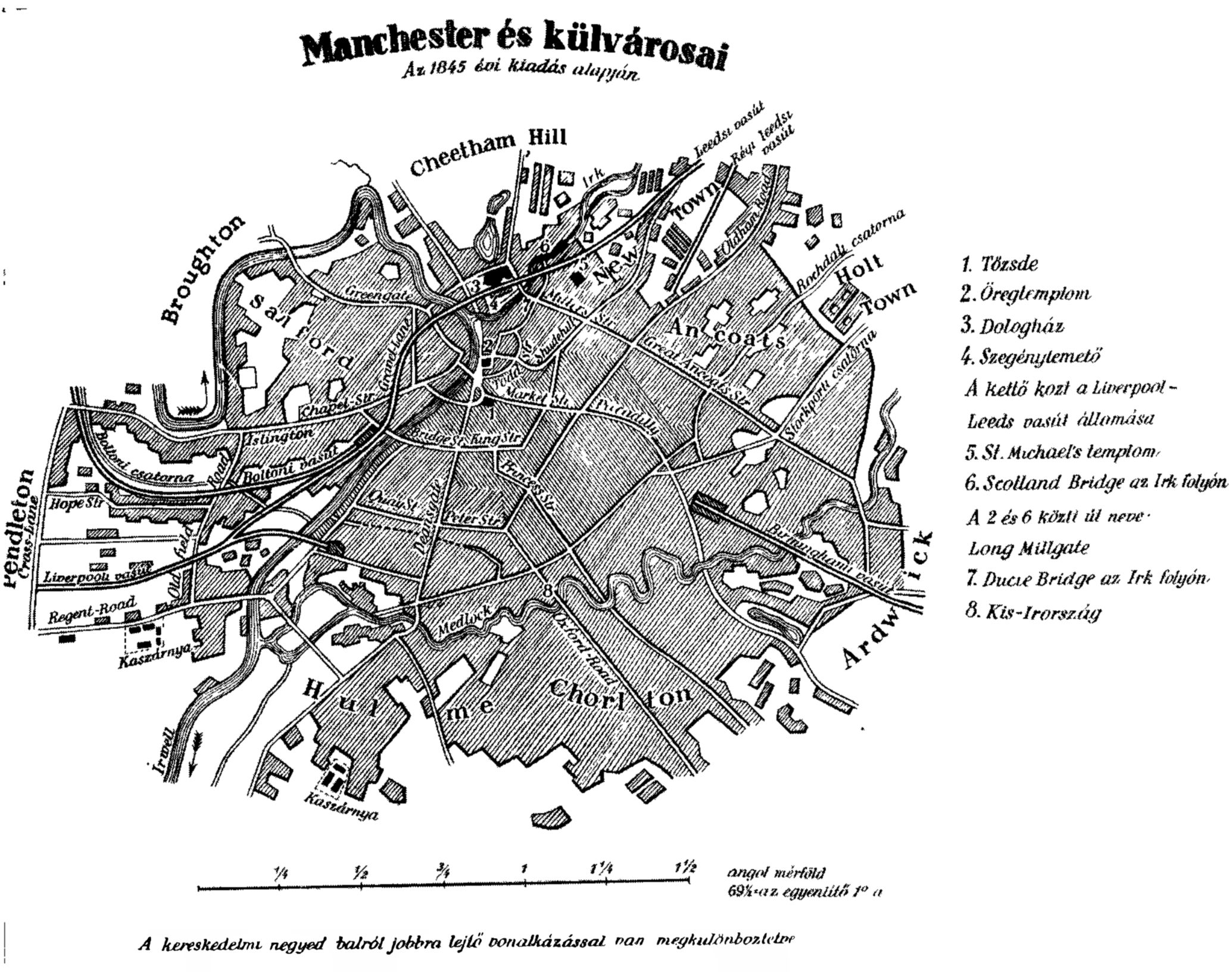 De hagyjuk ezeket a kisvárosokat. Mindegyiknek megvan a sajátossága, de a munkások általában éppúgy élnek ott is, mint Manchesterben; ezért csak sajátos építési módjukat vázoltam külön; egyébként a manchesteri munkáslakásokra vonatkozó összes általánosabb megállapítások teljesen érvényesek a környékbeli városokra is. Nézzük most magát Manchestert.