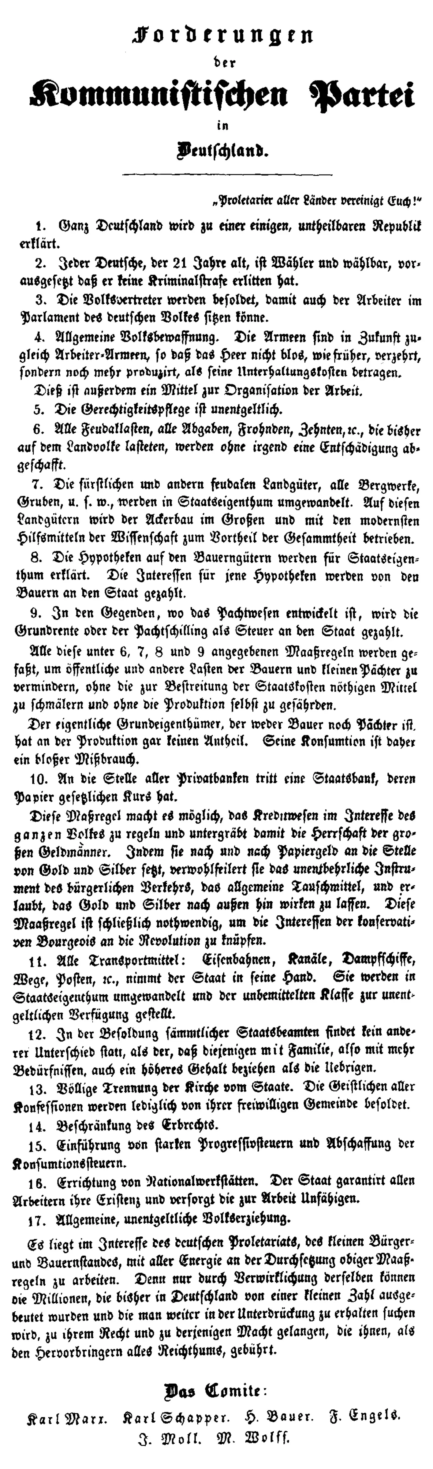 É do interesse do proletariado alemão, da pequena burguesia e dos pequenos camponeses trabalhar com toda a sua energia para implementar as medidas acima. Pois somente com a sua implementação, as milhões de pessoas na Alemanha — que até agora têm sido exploradas por um punhado de indivíduos e que continuarão sendo oprimidas — poderão conquistar os seus direitos e o poder que lhes cabe enquanto produtoras de toda a riqueza.
