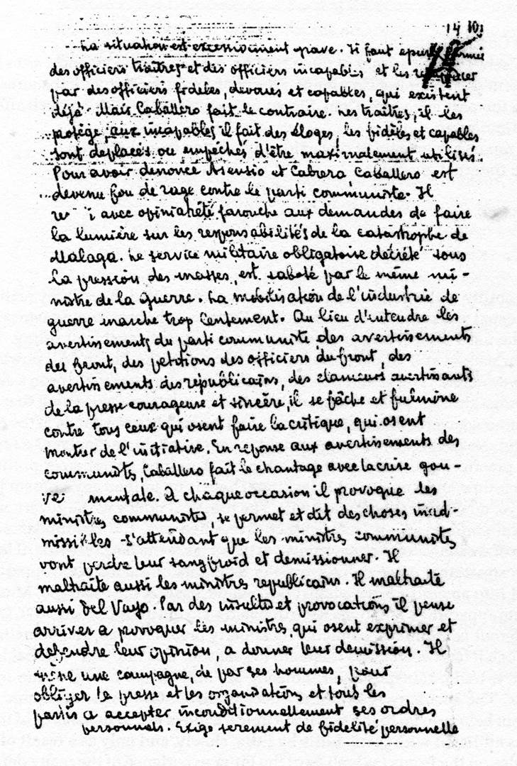 … Den 25 februari höll Caballero ett tal där han indirekt, men öppet angrep kommunistpartiet och de krafter som bistår kommunistpartiet med att genomföra alla uppgifter som jag just nämnt. På partiets initiativ anordnade Folkfronten den 14 februari en enorm demonstration i Valencia. Detta för att Caballero och kretsen kring honom skulle förstå att det var dags att vidta energiska åtgärder och framför allt göra sig av med de inkompetenta, sabotörerna och förrädarna i generalstaben. Demonstrationen var mycket stor. Dagen därpå låtsades Caballero fortfarande inte förstå och den 26 februari upprepade han dessutom i en kommuniké avsedd för allmän spridning, att demonstrationens syfte hade varit att tillförsäkra regeringen villkorslöst stöd. Sedan tillade han: ”Jag kommer inte att sitta kvar vid makten om min ställning inte är säker. Jag anser att den är det, men om inte alla delar denna uppfattning tänker jag inte stå i vägen.” Det innebär att han inför hela pressen öppet väckte frågan om sin avgång …